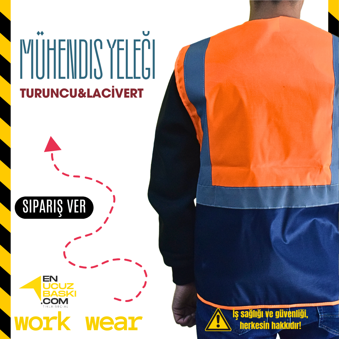 Baskılı Mühendis İkaz Yeleği Turuncu - Lacivert - İş Kıyafeti