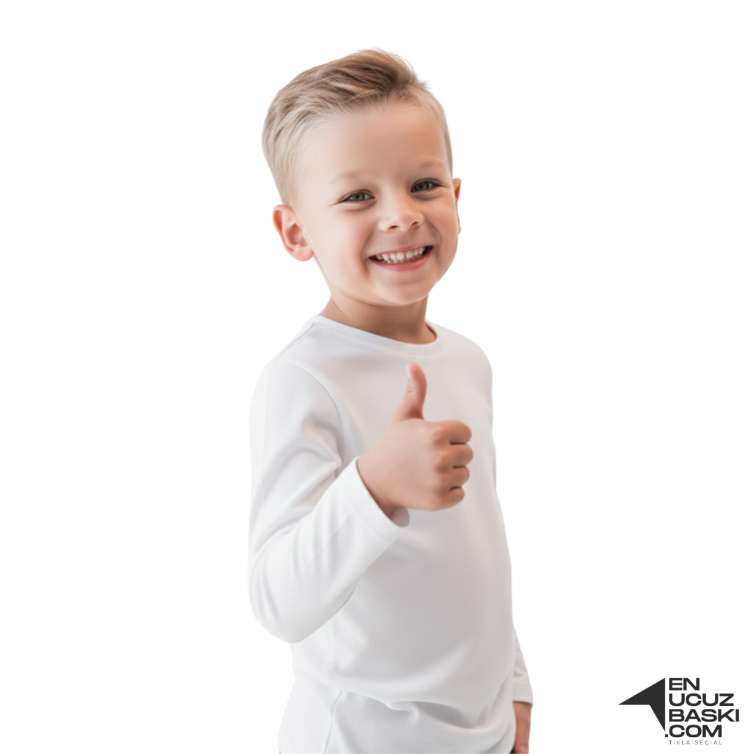 Sıfır Yaka Tişört Çocuk Uzun Kollu Beyaz
